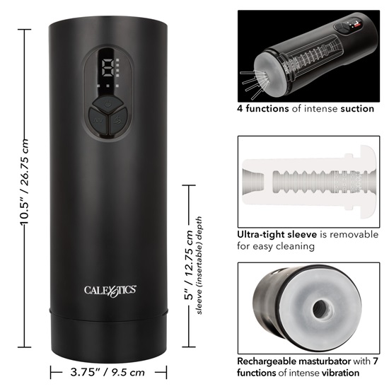 Wrap yourself in next level pleasure with the powerful Bionic Sucking and Vibrating Masturbator. This totally self-contained masturbator was made to envelop the senses with a fully customisable stroking experience. An ultra-tight textured chamber wraps tightly around you, while 4 intense functions of powerful suction and 7 independent functions of vibration deliver unparalleled pleasure with every stroke.