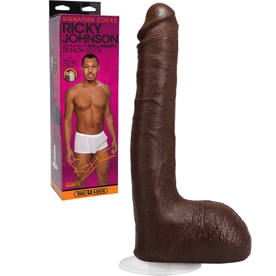 The Signature Cocks Ricky Johnson 10 Inch Ultraskyn Dildo With Balls by Doc Johnson is a vaginal and anal stimulating sex toy for women and men, this realistic dildo is flexible and soft to the touch. Molded directly from the Ricky Johnson porn star! the realistic textured details are Ultraskyn lifelike skin material making the feel and flexibility of a real 10 inch penis.