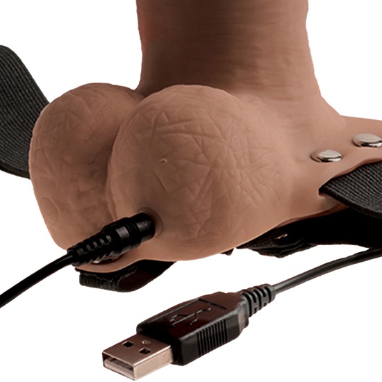 The FF 6 inch Hollow Rechargeable Strap-On with Balls features a super-strong Japanese motor that offers 10 vibration modes to choose from, sending vibrations concentrated at the tip of the dildo, precisely where your partner wants them most.